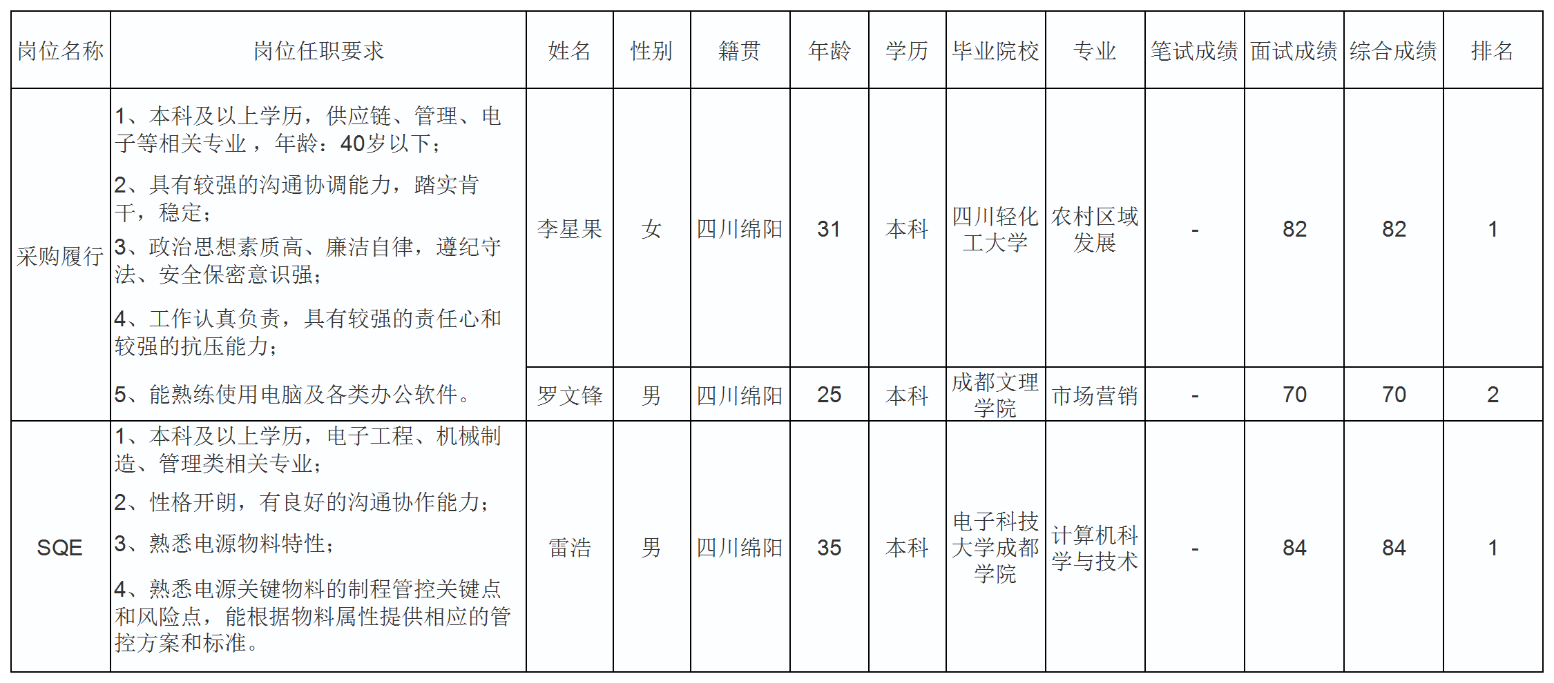 根據(jù)四川九州電子科技股份有限公司發(fā)布的招聘公告及招聘相關規(guī)定,經(jīng)筆試、面試等程序,現(xiàn)將筆試(面試)成績予以公示。