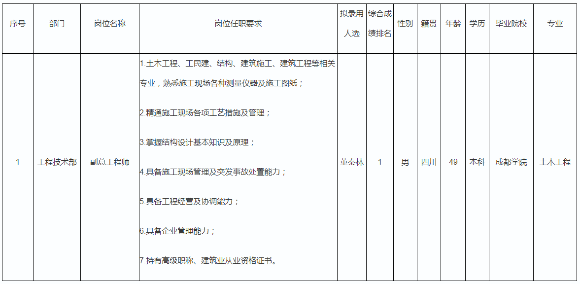 根據(jù)四川九洲建筑工程有限責(zé)任公司發(fā)布的招聘公告及招聘相關(guān)規(guī)定,經(jīng)筆試、面試、考察、體檢等程序,擬錄用董秦林同志到九洲建工工作,現(xiàn)予以公示,具體情況如下: