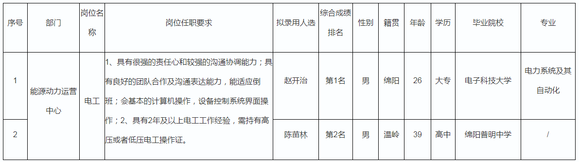 根據(jù)四川長虹電器股份有限公司發(fā)布的招聘公告及招聘相關(guān)規(guī)定,經(jīng)筆試、面試、考察、體檢等程序,擬錄用趙開治等同志到能源動力運營中心工作,現(xiàn)予以公示,具體情況如下: