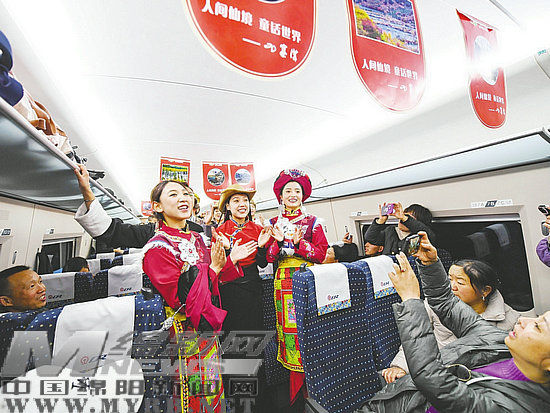 隨著川青鐵路四川首段開通運行,安州區(qū)告別了不通火車的歷史,一步邁入“動車時代”。圖為11月28日,在C6008次首發(fā)列車上,來自阿壩州民族歌舞團的演員為乘客表演節(jié)目。(新華社記者 王曦 攝)