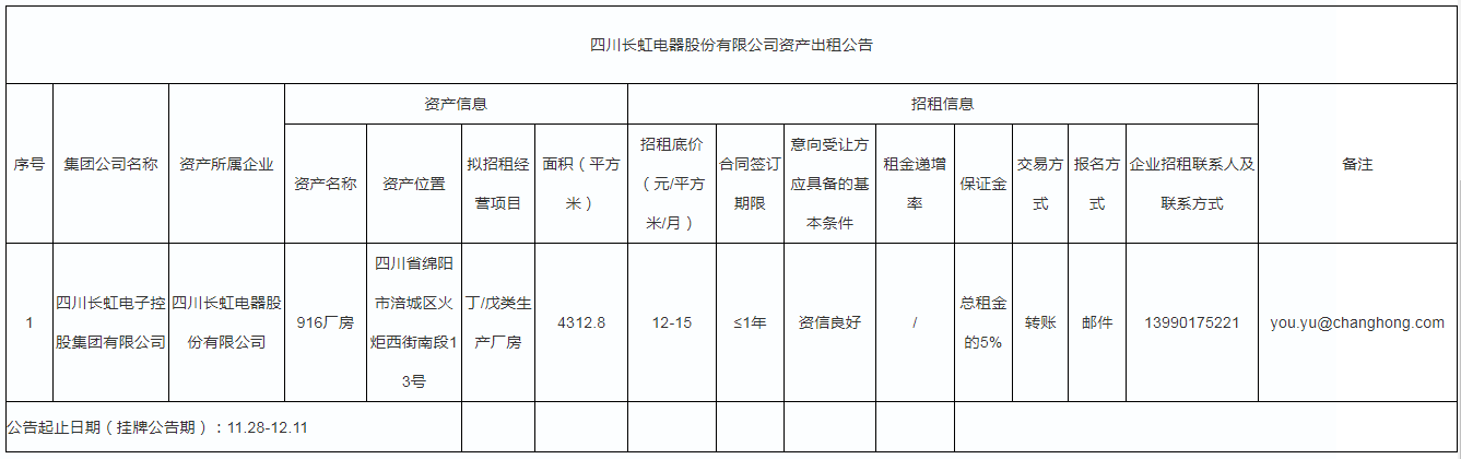 四川長(zhǎng)虹電器股份有限公司資產(chǎn)出租公告