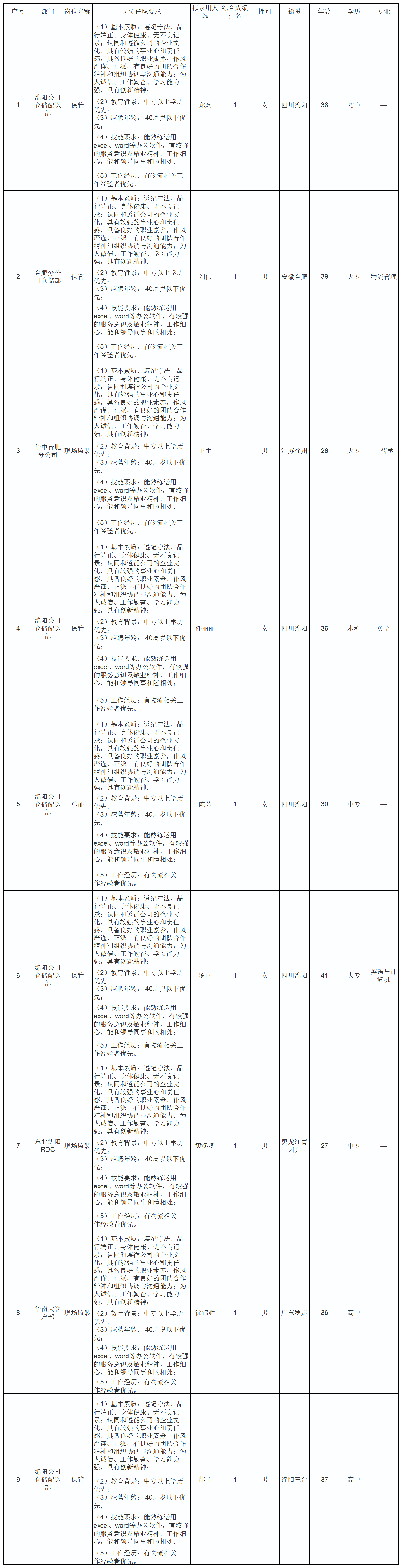 根據四川長虹民生物流股份有限公司發(fā)布的招聘公告及招聘相關規(guī)定,經筆試、面試、考察、體檢等程序,擬錄用鄭歡等9名同志到四川長虹民生物流股份有限公司工作,現予以公示,具體情況如下: