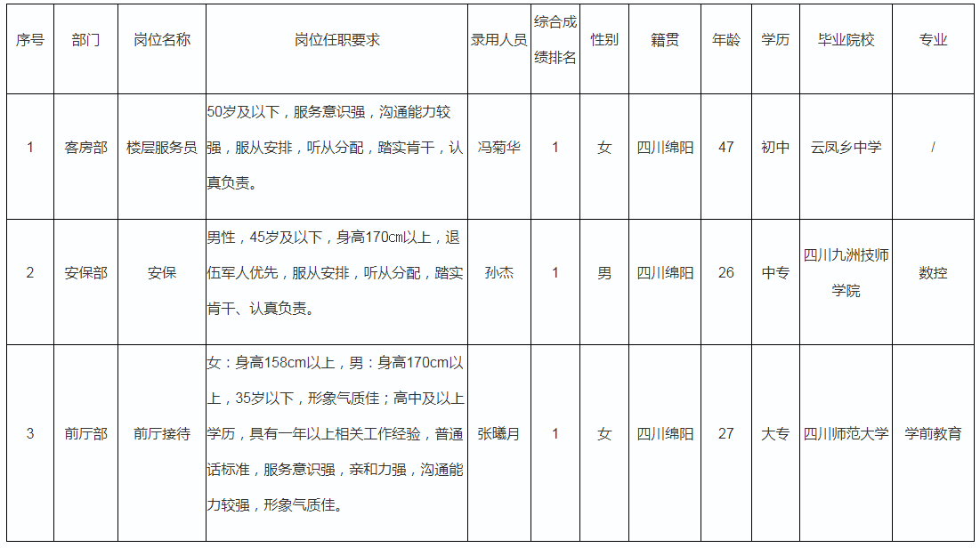 根據(jù)綿陽科發(fā)會(huì)展酒店有限責(zé)任公司鉑驪分公司發(fā)布的招聘公告及招聘相關(guān)規(guī)定,經(jīng)面試、考察、體檢等程序,錄用馮菊華、孫杰、張曦月三名同志到科發(fā)鉑驪酒店工作,現(xiàn)予以公示,具體情況如下: