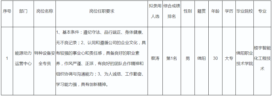 根據(jù)四川長(zhǎng)虹電器股份有限公司發(fā)布的招聘公告及招聘相關(guān)規(guī)定,經(jīng)筆試、面試、考察、體檢等程序,擬錄用蔡濤等同志到能源動(dòng)力運(yùn)營(yíng)中心工作,現(xiàn)予以公示,具體情況如下: