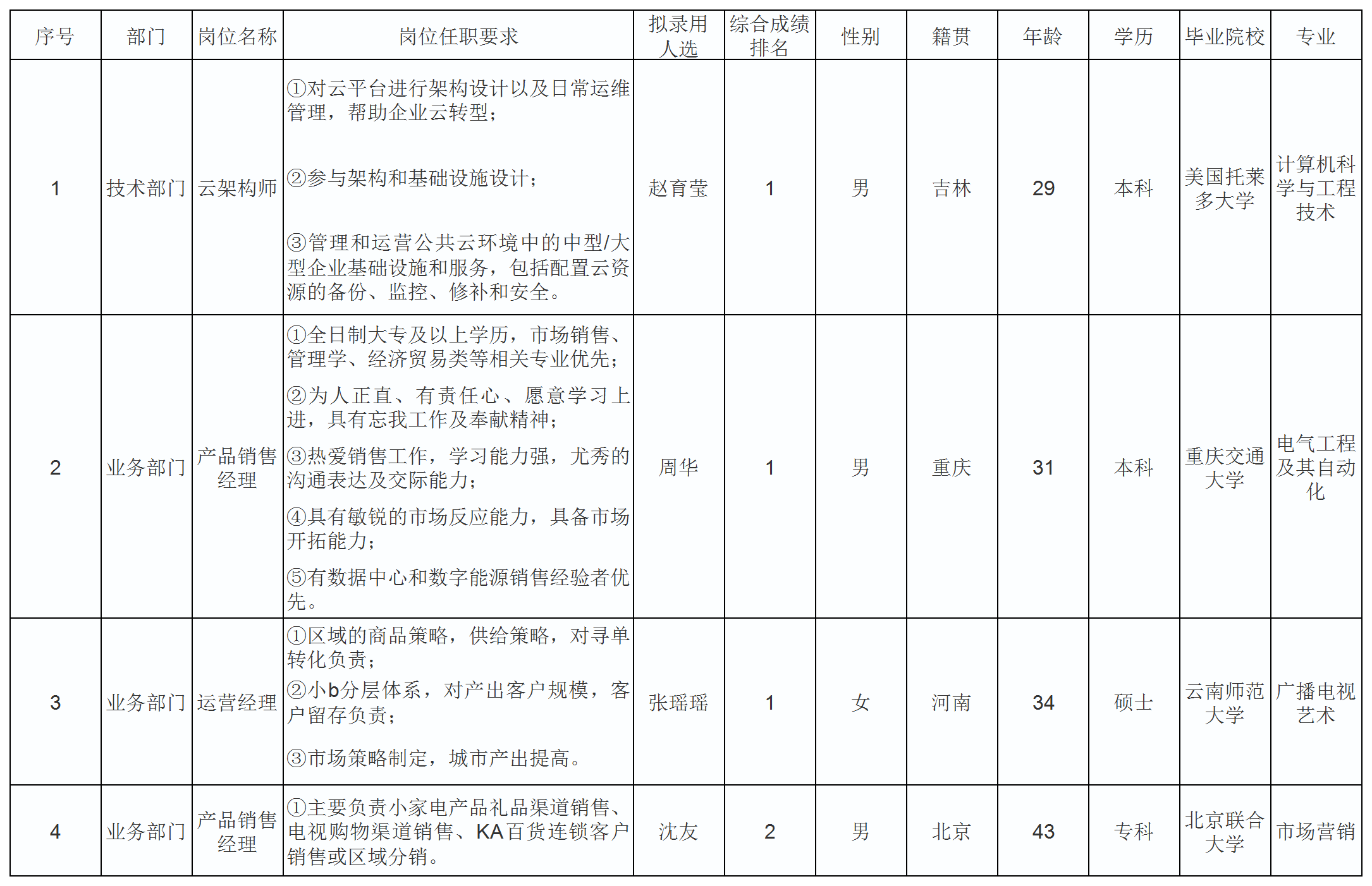 根據(jù)四川長虹佳華信息產(chǎn)品有限責(zé)任公司發(fā)布的招聘公告及招聘相關(guān)規(guī)定,經(jīng)筆試、面試、考察、體檢等程序,擬錄用趙育瑩、周華、張瑤瑤、沈友同志到四川長虹佳華信息產(chǎn)品有限責(zé)任公司工作,現(xiàn)予以公示,具體情況如下: