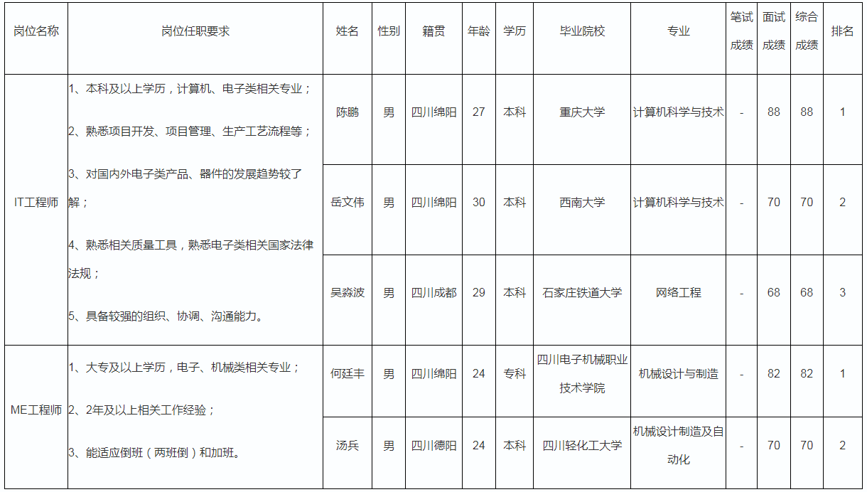 根據(jù)四川九州電子科技股份有限公司發(fā)布的招聘公告及招聘相關(guān)規(guī)定,經(jīng)筆試、面試等程序,現(xiàn)將筆試(面試)成績(jī)予以公示。