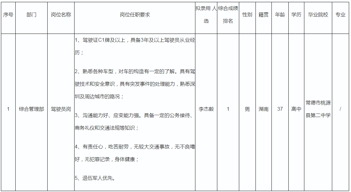 根據(jù)深圳市九洲投資發(fā)展有限公司發(fā)布的招聘公告及招聘相關(guān)規(guī)定,經(jīng)筆試、面試、考察、體檢等程序,擬錄用李杰毅同志到深圳市九洲投資發(fā)展有限公司工作,現(xiàn)予以公示,具體情況如下: