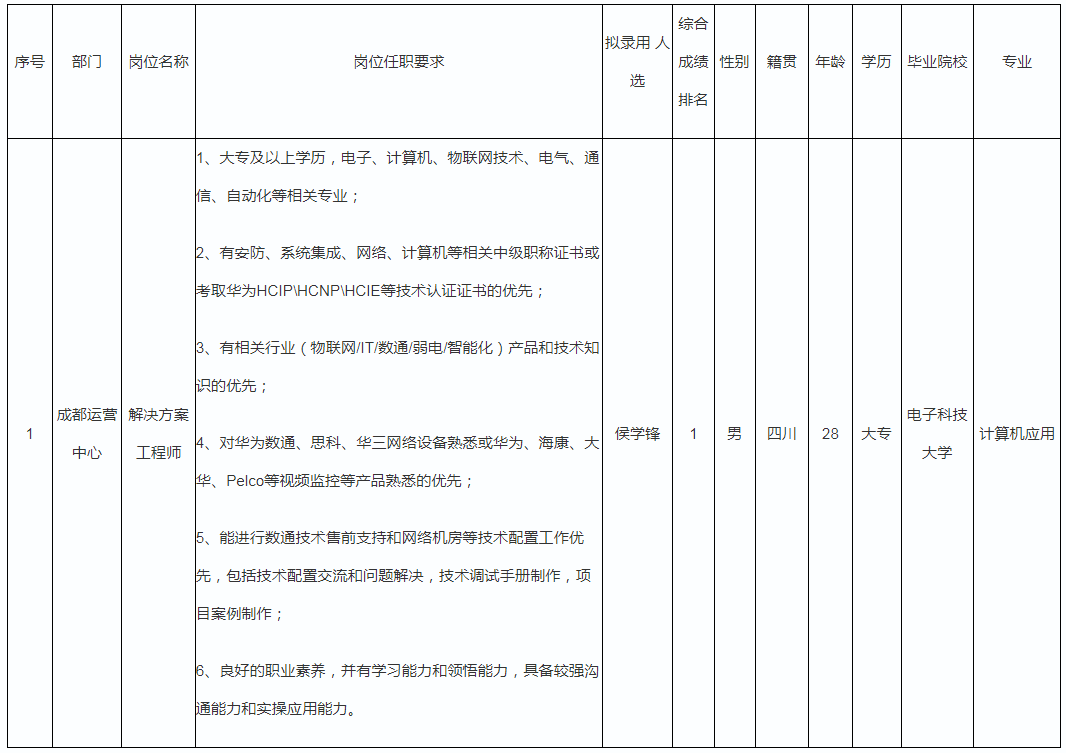 根據(jù)四川科瑞軟件有限責(zé)任公司發(fā)布的招聘公告及招聘相關(guān)規(guī)定,經(jīng)筆試、面試、考察、體檢等程序,擬錄用侯學(xué)鋒同志到四川科瑞軟件有限責(zé)任公司工作,現(xiàn)予以公示,具體情況如下: