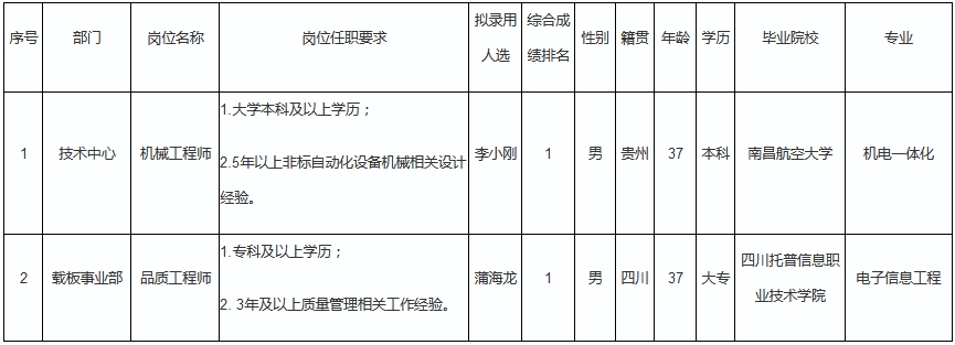 根據宜賓紅星電子有限公司發(fā)布的招聘公告及招聘相關規(guī)定,經面試、體檢程序,擬錄用李小剛、蒲海龍兩名同志到宜賓紅星電子有限公司工作,現(xiàn)予以公示,具體情況如下: