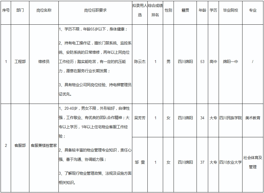 根據(jù)四川長虹物業(yè)服務(wù)有限責(zé)任公司綿陽分公司發(fā)布的招聘公告及招聘相關(guān)規(guī)定,經(jīng)筆試、面試、考察、體檢等程序,擬錄用陳云杰、吳芳芳、鄒雯同志分別到金嶺1號(hào)、桐里華庭管理處工作?,F(xiàn)予以公示,具體情況如下:
