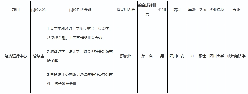 根據(jù)四川波鴻實(shí)業(yè)有限公司發(fā)布的招聘公告及招聘相關(guān)規(guī)定,經(jīng)面試綜合評(píng)估,擬錄用羅俊峰為經(jīng)濟(jì)運(yùn)行中心管培生,現(xiàn)予以公示,具體情況如下: