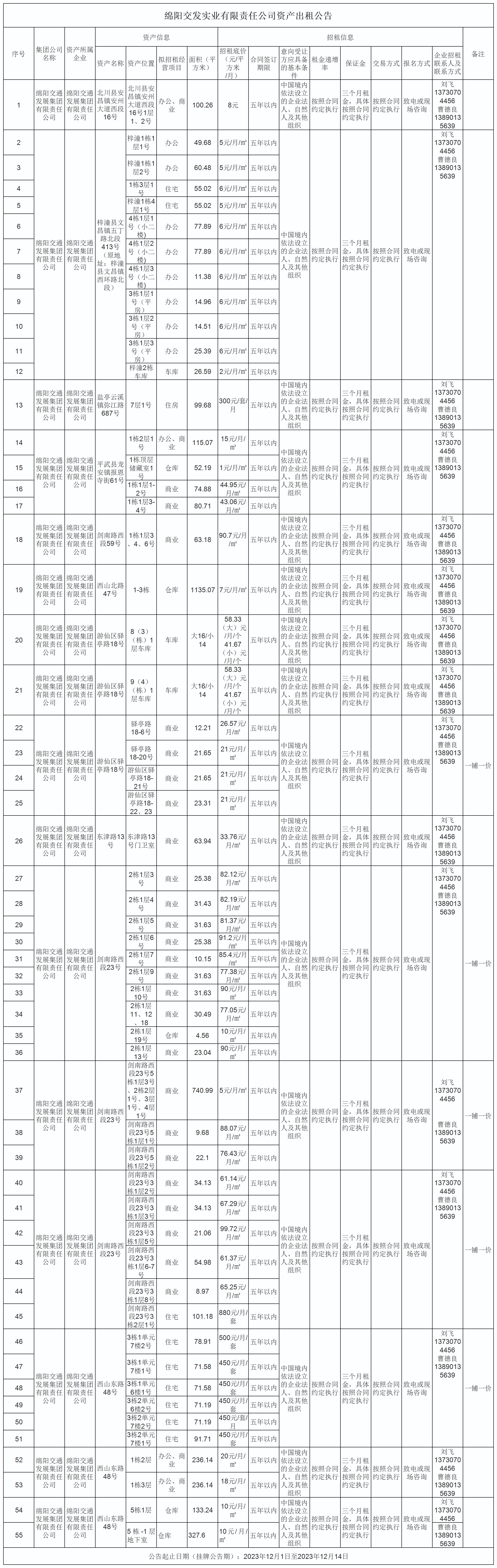 綿陽交發(fā)實(shí)業(yè)有限責(zé)任公司現(xiàn)有部分經(jīng)營(yíng)性資產(chǎn)(商業(yè)門面、辦公樓、倉庫及住房)對(duì)外公開招租,資產(chǎn)位于綿陽市涪城區(qū)、游仙區(qū)、梓潼、北川、鹽亭、平武等市、縣的中心地段,歡迎有意向的單位、個(gè)體工商戶、自然人報(bào)名競(jìng)價(jià),現(xiàn)將相關(guān)事宜公告如下: