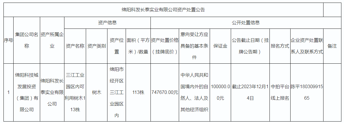 綿陽科發(fā)長泰實業(yè)有限公司資產(chǎn)處置公告
