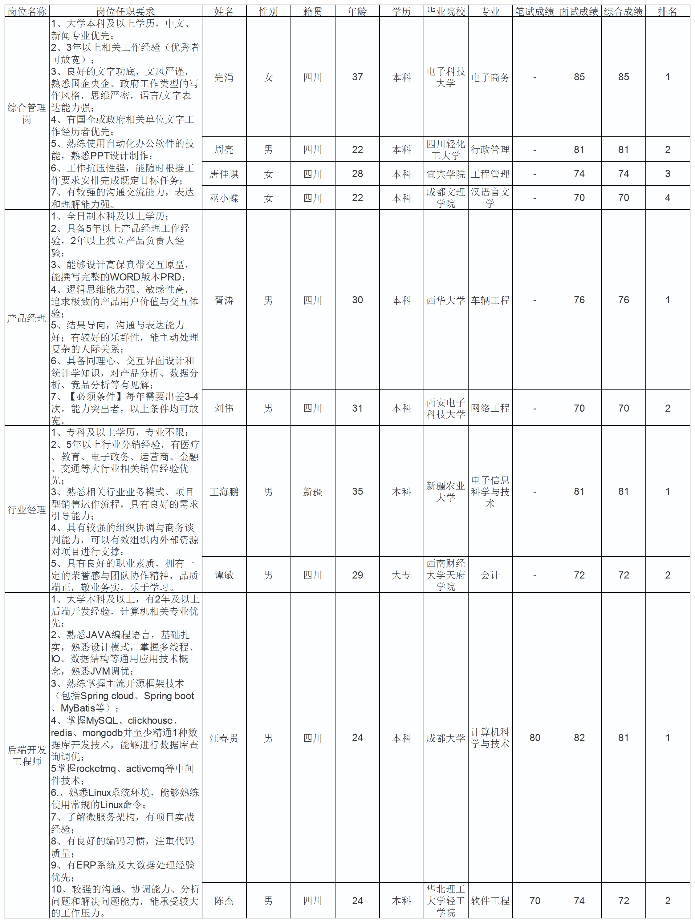 根據(jù)四川科瑞軟件有限責任公司發(fā)布的招聘公告及招聘相關規(guī)定,經(jīng)筆試、面試等程序,現(xiàn)將筆試(面試)成績予以公示。