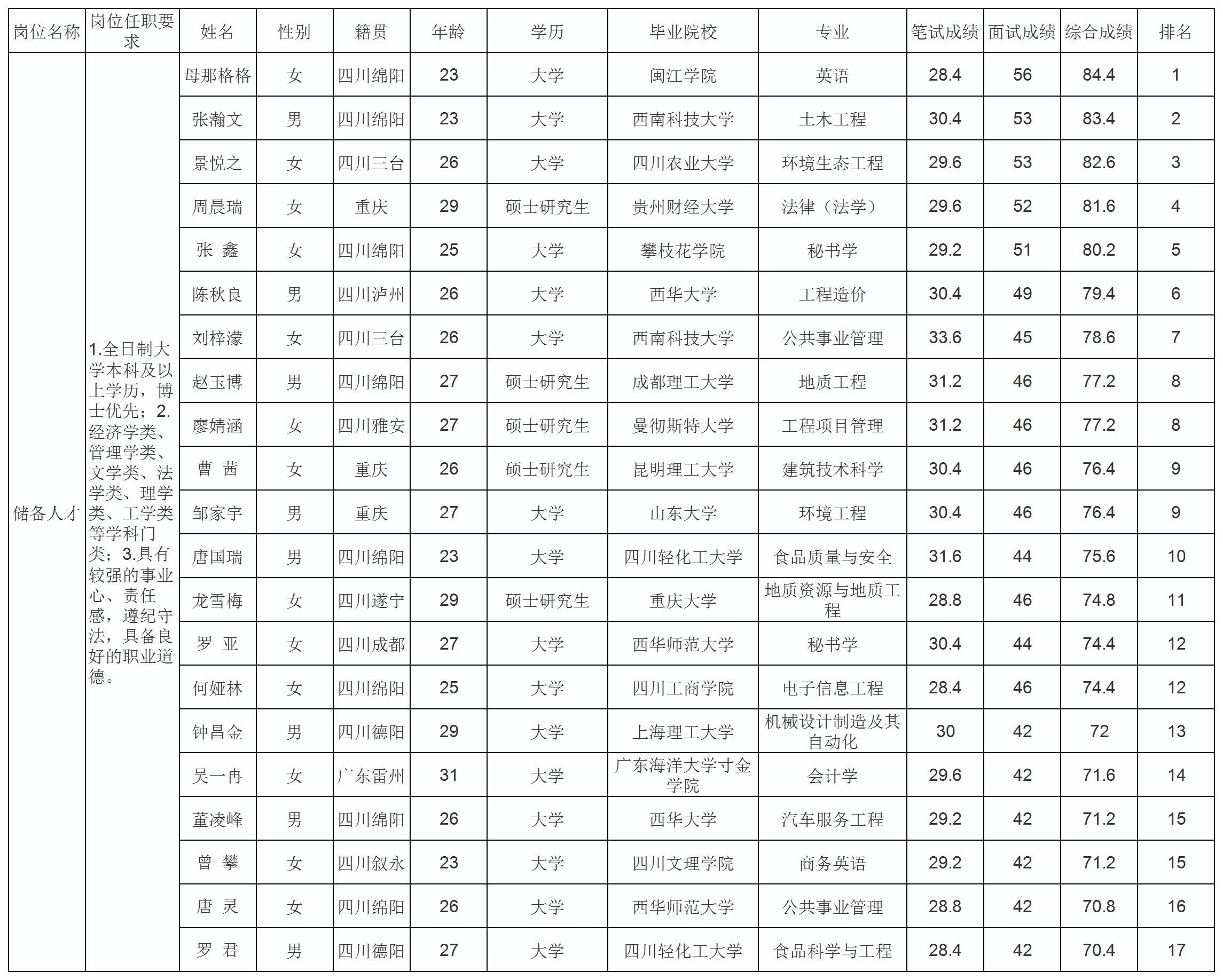 根據(jù)綿陽(yáng)燃?xì)饧瘓F(tuán)有限公司發(fā)布的招聘公告及招聘相關(guān)規(guī)定,經(jīng)筆試、面試等程序,現(xiàn)將綜合成績(jī)予以公示。