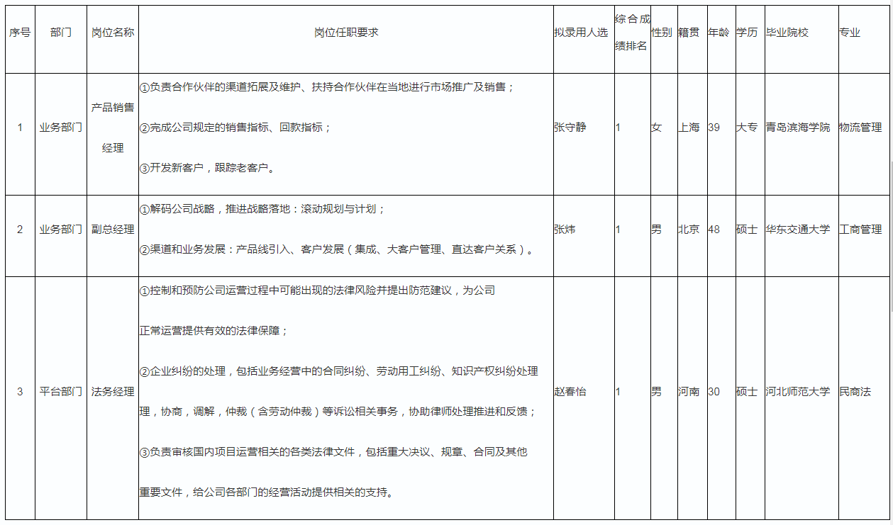 根據(jù)四川長(zhǎng)虹佳華信息產(chǎn)品有限責(zé)任公司發(fā)布的招聘公告及招聘相關(guān)規(guī)定,經(jīng)筆試、面試、考察、體檢等程序,擬錄用張守靜、張煒、趙春怡同志到四川長(zhǎng)虹佳華信息產(chǎn)品有限責(zé)任公司工作,現(xiàn)予以公示,具體情況如下: