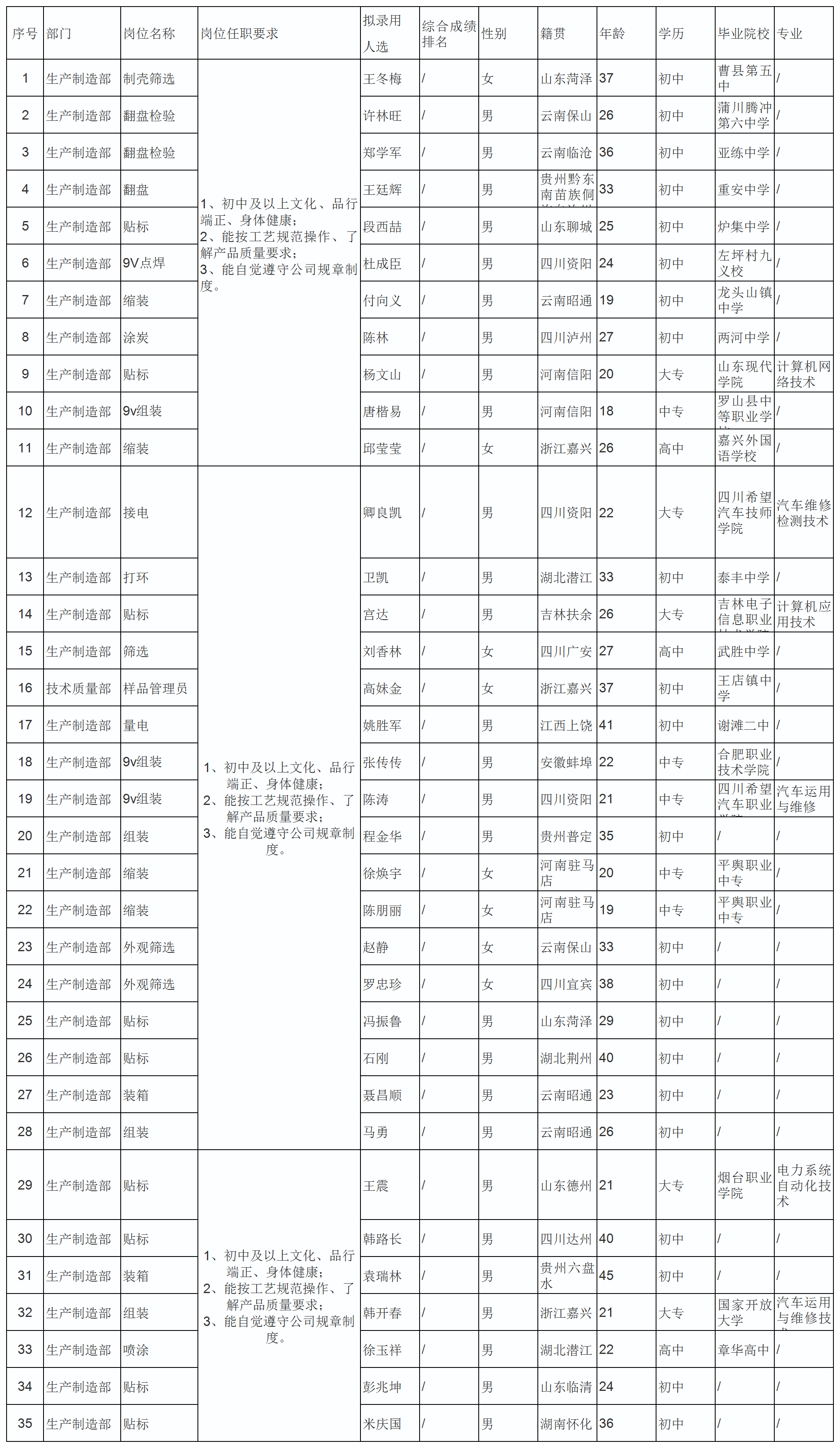 根據(jù)浙江長(zhǎng)虹飛獅電器工業(yè)有限公司發(fā)布的招聘公告及招聘相關(guān)規(guī)定,經(jīng)面試、體檢等程序,擬錄用王冬梅等35名同志到浙江長(zhǎng)虹飛獅電器工業(yè)有限公司工作,現(xiàn)予以公示,具體情況如下: