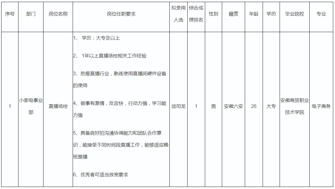 根據(jù)公司經(jīng)營管理需要,小家電事業(yè)部招聘直播場控崗位1人,經(jīng)簡歷篩選、面試、體檢等程序,談司龍滿足錄用條件,現(xiàn)予以公示。