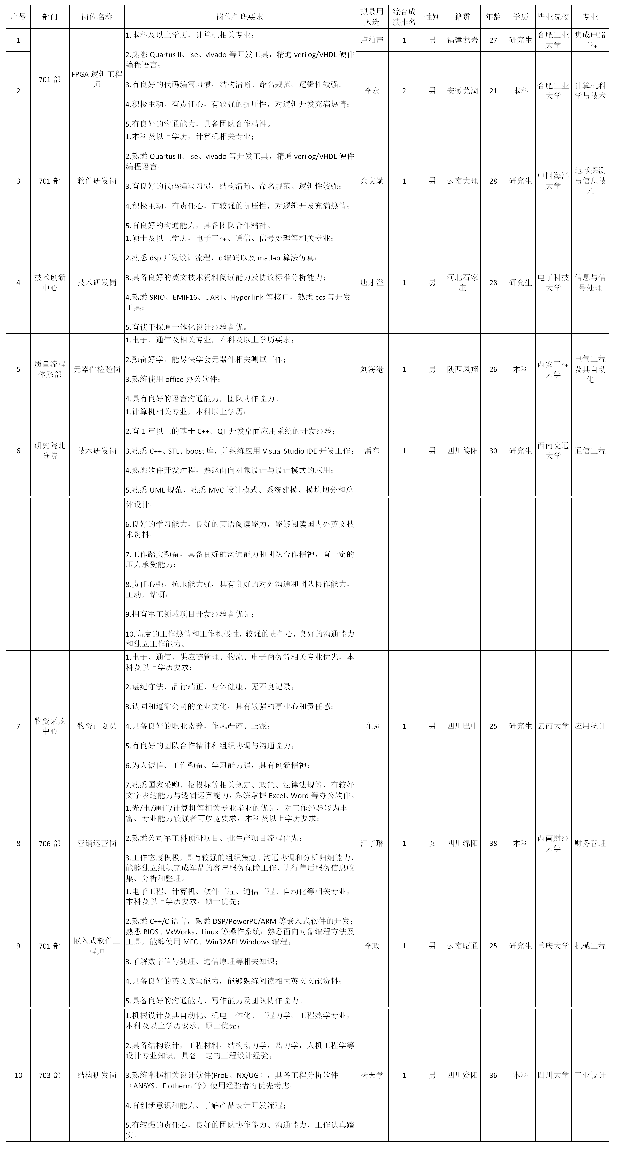 根據(jù)四川九洲電器集團(tuán)有限責(zé)任公司發(fā)布的招聘公告及招聘相關(guān)規(guī)定,經(jīng)筆試、面試、考察、體檢等程序,擬錄用盧柏聲、李永等10位同志到四川九洲電器集團(tuán)有限責(zé)任公司工作,現(xiàn)予以公示,具體情況如下: