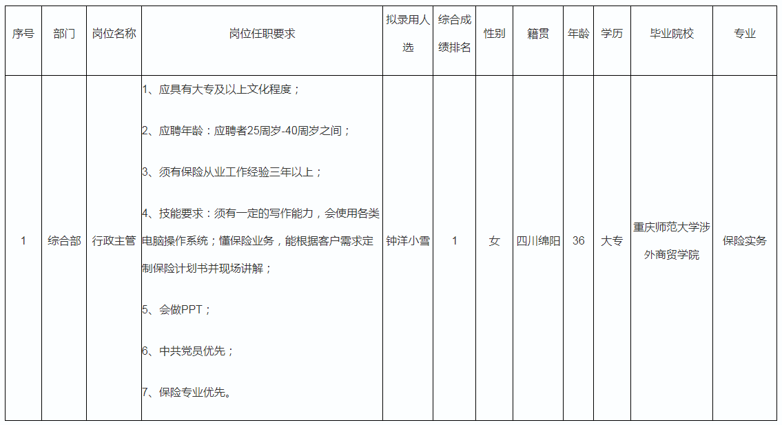 根據(jù)四川九洲保險代理有限公司發(fā)布的招聘公告及招聘相關(guān)規(guī)定,經(jīng)筆試、面試、考察、體檢等程序,擬錄用鐘洋小雪同志到四川九洲保險代理有限公司工作,現(xiàn)予以公示,具體情況如下: