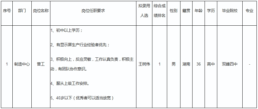 根據(jù)深圳市九洲光電科技有限公司發(fā)布的招聘公告及招聘相關(guān)規(guī)定,經(jīng)筆試、面試、考察、體檢等程序,擬錄用王樹(shù)偉同志到深圳市九洲光電科技有限公司工作,現(xiàn)予以公示,具體情況如下: