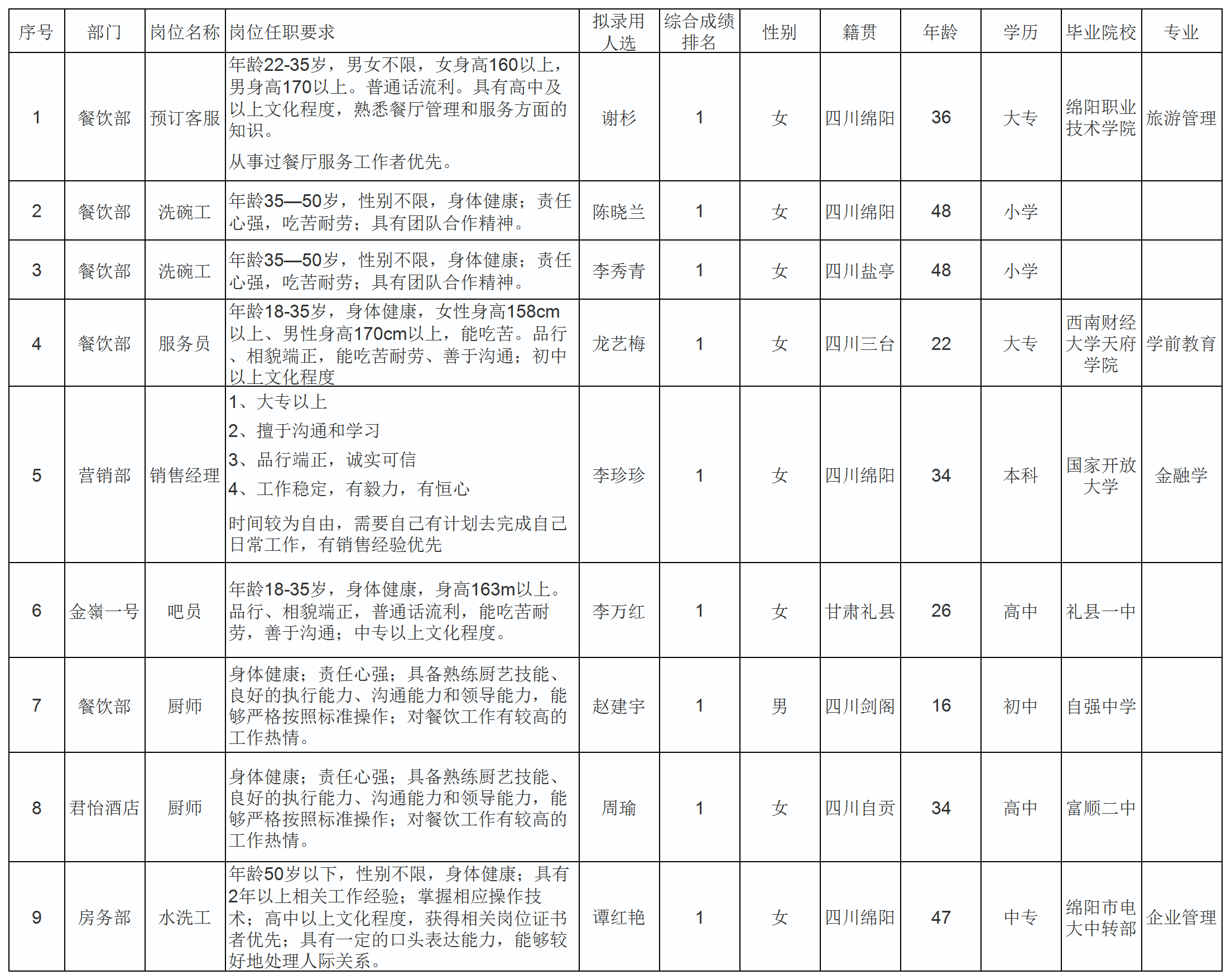 根據(jù)四川長虹國際酒店有限責(zé)任公司發(fā)布的招聘公告及招聘相關(guān)規(guī)定,經(jīng)筆試、面試、考察、體檢等程序,擬錄用謝杉等九名同志到長虹國際酒店工作,現(xiàn)予以公示,具體情況如下: