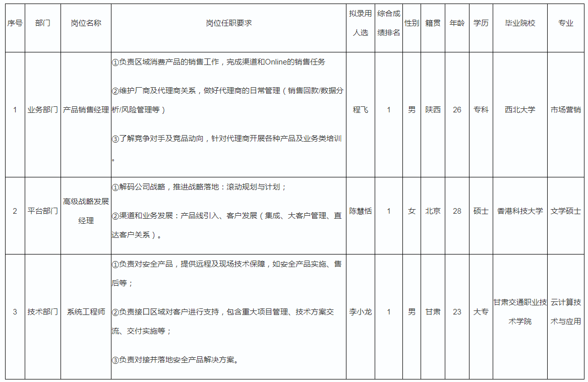 根據(jù)四川長(zhǎng)虹佳華信息產(chǎn)品有限責(zé)任公司發(fā)布的招聘公告及招聘相關(guān)規(guī)定,經(jīng)筆試、面試、考察、體檢等程序,擬錄用程飛、陳慧恬、李小龍同志到四川長(zhǎng)虹佳華信息產(chǎn)品有限責(zé)任公司工作,現(xiàn)予以公示,具體情況如下: