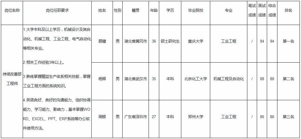 根據(jù)四川波鴻實(shí)業(yè)有限公司發(fā)布的招聘公告及招聘相關(guān)規(guī)定,經(jīng)面試,現(xiàn)將威斯卡特工業(yè)(中國)有限公司持續(xù)改善部工程師成績予以公示。