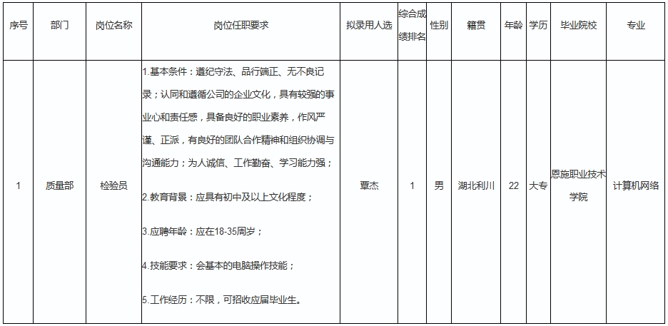 根據(jù)武漢九州芯技術(shù)有限公司發(fā)布的招聘公告及招聘相關(guān)規(guī)定,經(jīng)面試、考察、體檢等程序,擬錄用覃杰同志到武漢九州芯技術(shù)有限公司工作,現(xiàn)予以公示,具體情況如下: