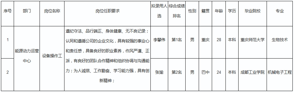 根據(jù)四川長(zhǎng)虹電器股份有限公司發(fā)布的招聘公告及招聘相關(guān)規(guī)定,經(jīng)筆試、面試、考察、體檢等程序,擬錄用李攀偉等同志到能源動(dòng)力運(yùn)營(yíng)中心工作,現(xiàn)予以公示,具體情況如下: