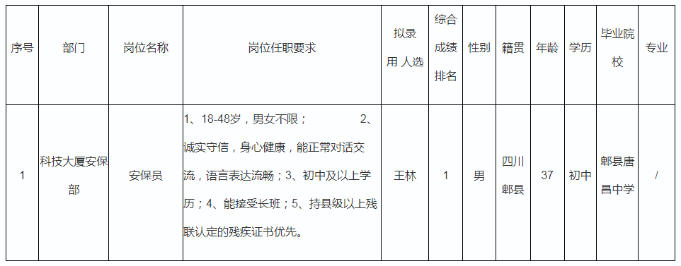 根據(jù)四川長虹物業(yè)服務(wù)有限責(zé)任公司成都分公司發(fā)布的招聘公告及招聘相關(guān)規(guī)定,經(jīng)筆試、面試、考察、體檢等程序,擬錄用王林同志到科技大廈管理處工作,現(xiàn)予以公示,具體情況如下: