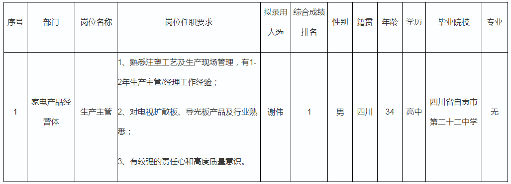 根據(jù)長虹模塑公司發(fā)布的招聘公告及招聘相關(guān)規(guī)定,經(jīng)筆試、面試、考察、體檢等程序,擬錄用謝偉同志到中山長虹模塑科技有限公司任職生產(chǎn)主管工作,現(xiàn)予以公示,具體情況如下:
