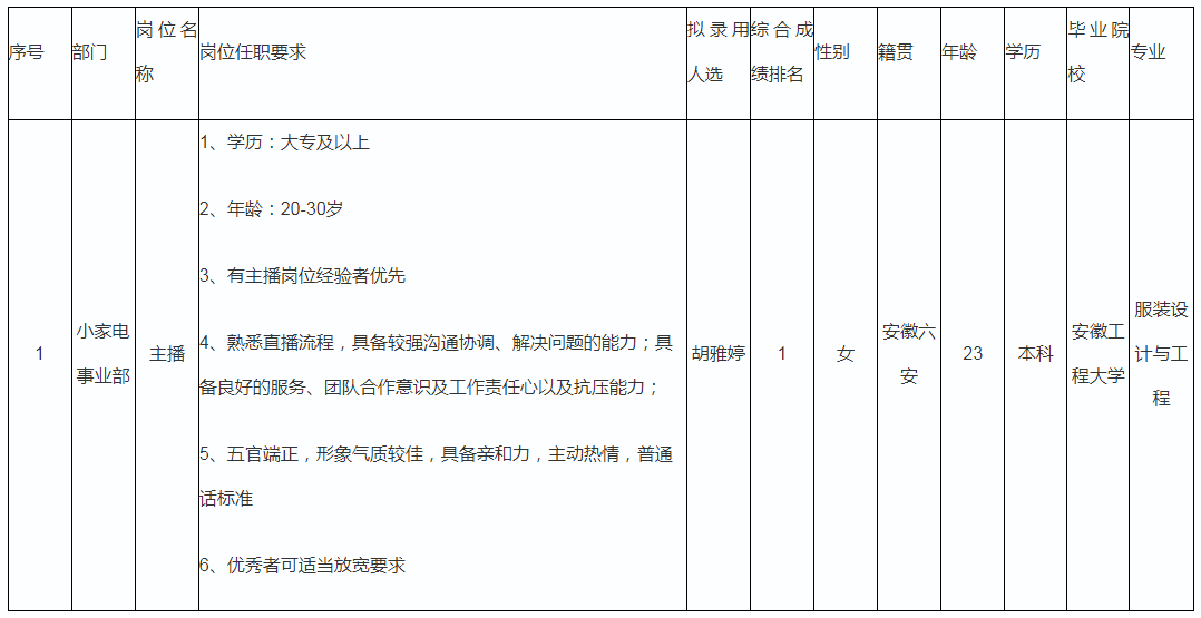 根據(jù)公司經(jīng)營管理需要,小家電事業(yè)部招聘主播崗位1人,經(jīng)簡歷篩選、面試、體檢等程序,胡雅婷滿足錄用條件,現(xiàn)予以公示。