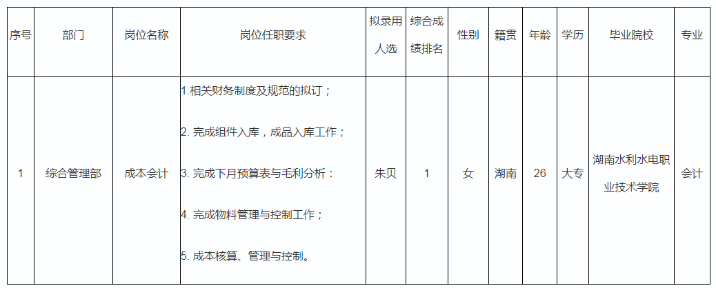 根據(jù)廣東長(zhǎng)虹器件科技有限公司發(fā)布的招聘公告及招聘相關(guān)規(guī)定,經(jīng)筆試、面試、考察、體檢等程序,擬錄用朱貝同志到廣東長(zhǎng)虹器件科技有限公司工作,現(xiàn)予以公示,具體情況如下: