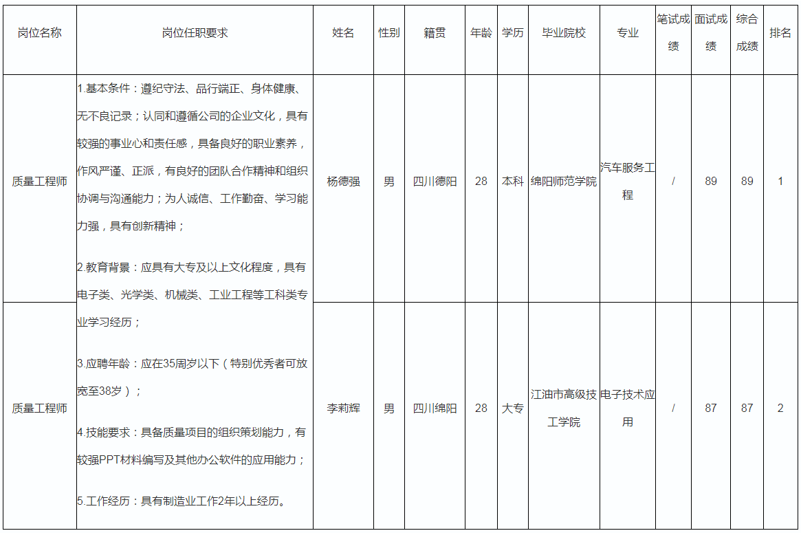 根據(jù)四川九華光子通信技術(shù)有限公司發(fā)布的招聘公告及招聘相關(guān)規(guī)定,經(jīng)面試程序,現(xiàn)將面試成績予以公示。