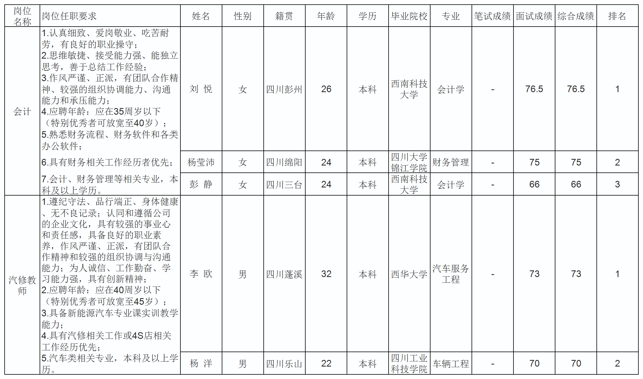 根據(jù)四川九洲教育投資管理有限公司發(fā)布的招聘公告及招聘相關(guān)規(guī)定,經(jīng)筆試、面試等程序,現(xiàn)將筆試(面試)成績予以公示。