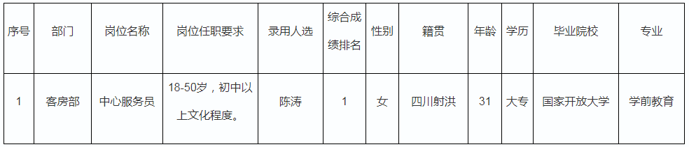 根據(jù)綿陽綿州酒店有限公司發(fā)布的招聘公告及招聘相關(guān)規(guī)定,經(jīng)面試、體檢等程序,擬錄用陳濤同志到客房部工作,現(xiàn)予以公示,具體情況如下: