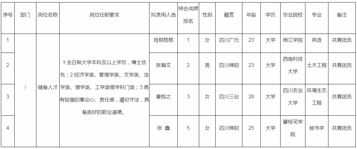 根據(jù)綿陽燃氣集團有限公司發(fā)布的招聘公告及招聘相關(guān)規(guī)定,經(jīng)筆試、面試、考察、體檢等程序,擬錄用以下四名同志到相應(yīng)崗位工作,現(xiàn)予以公示,具體情況如下: