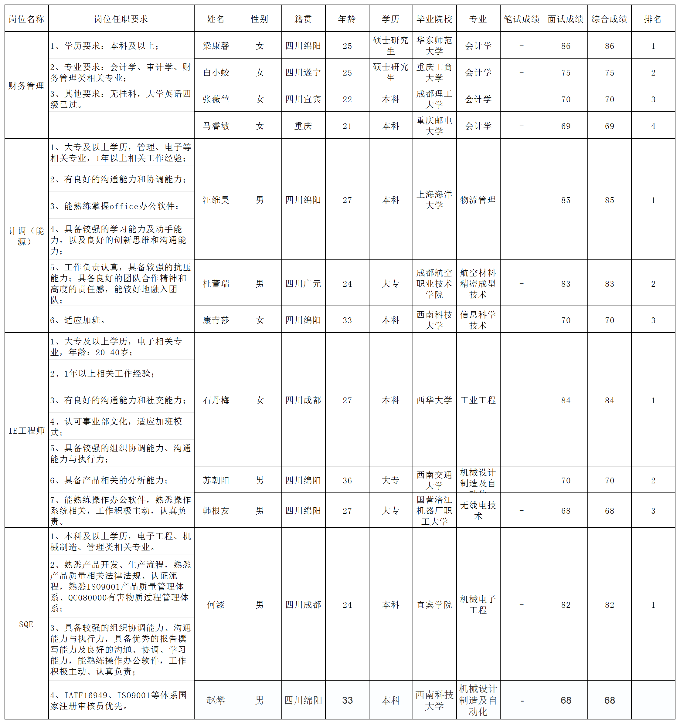根據(jù)四川九州電子科技股份有限公司發(fā)布的招聘公告及招聘相關(guān)規(guī)定,經(jīng)筆試、面試等程序,現(xiàn)將筆試(面試)成績(jī)予以公示。