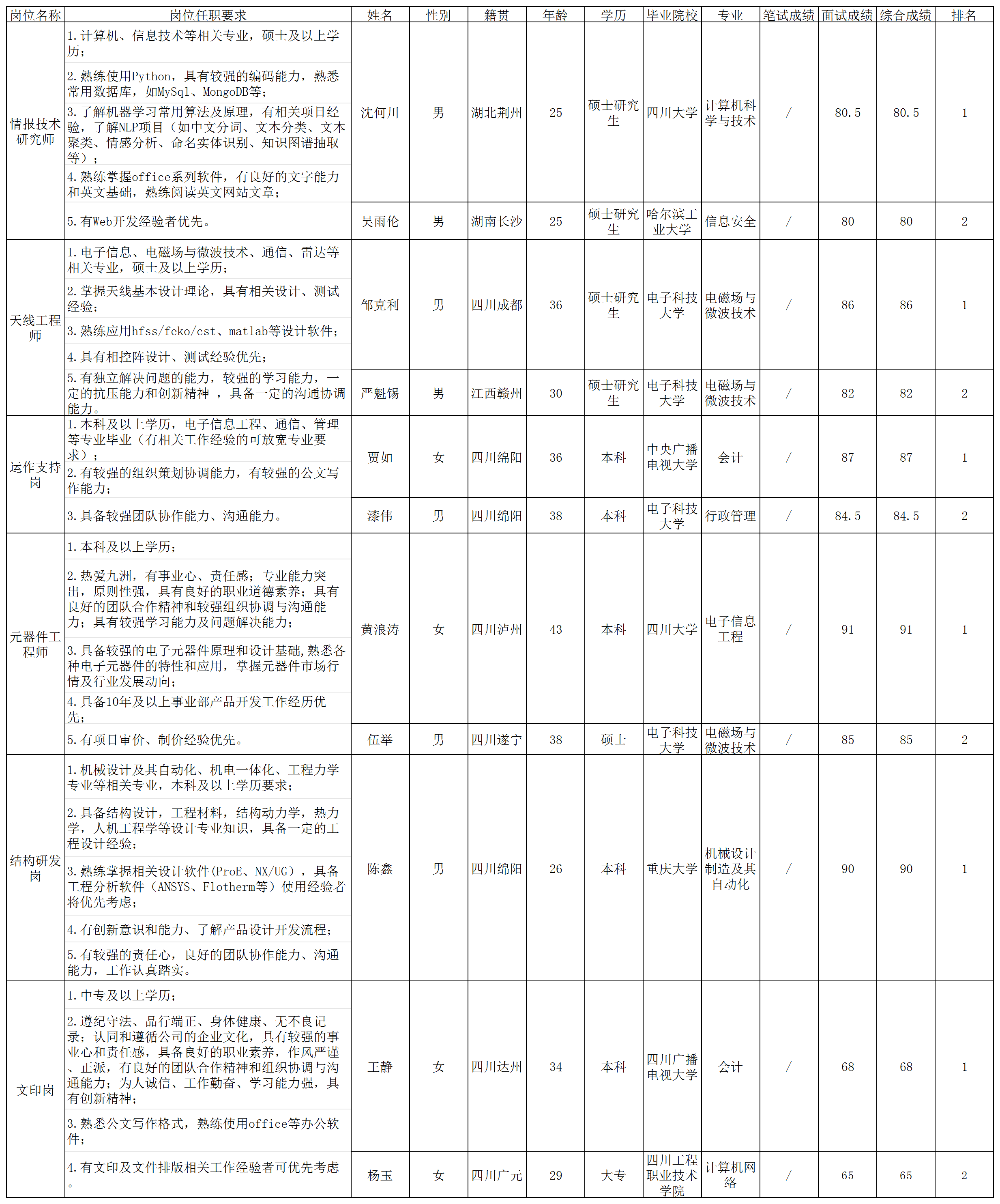 根據(jù)四川九洲電器集團(tuán)有限責(zé)任公司發(fā)布的招聘公告及招聘相關(guān)規(guī)定,經(jīng)筆試、面試等程序,現(xiàn)將筆試(面試)成績(jī)予以公示。