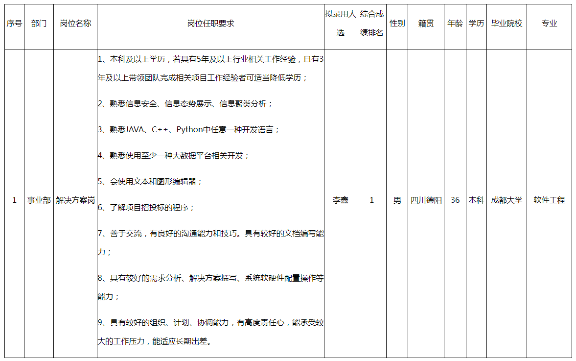 根據(jù)成都九洲電子信息系統(tǒng)股份有限公司發(fā)布的招聘公告及招聘相關(guān)規(guī)定,經(jīng)筆試、面試、考察等程序,擬錄用李鑫同志到成都九洲電子信息系統(tǒng)股份有限公司工作,現(xiàn)予以公示,具體情況如下: