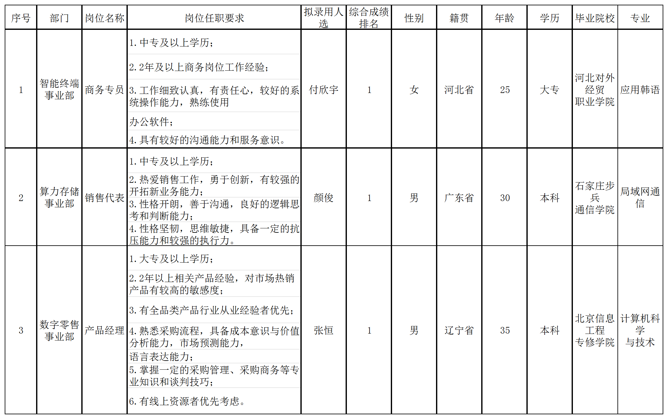 根據(jù)北京九洲科瑞科技有限公司發(fā)布的招聘公告及招聘相關規(guī)定,經(jīng)筆試、面試、考察、體檢等程序,擬錄用付欣宇、顏俊、張恒同志到公司工作,現(xiàn)予以公示,具體情況如下: