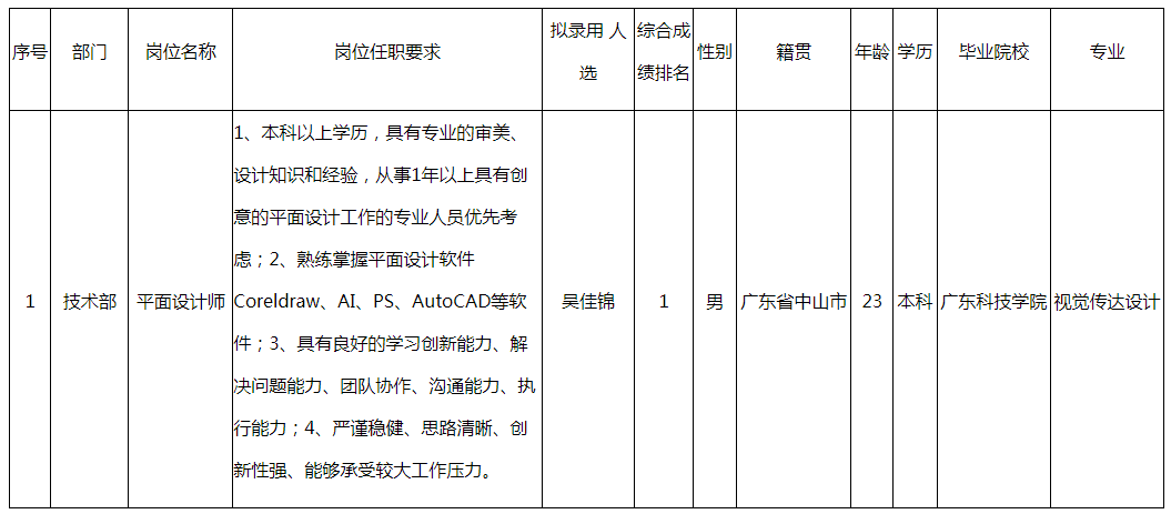 根據(jù)中山長虹電器有限公司發(fā)布的招聘公告及招聘相關(guān)規(guī)定,經(jīng)面試、考察、體檢等程序,擬錄用吳佳錦同志到平面設(shè)計師工作,現(xiàn)予以公示,具體情況如下: