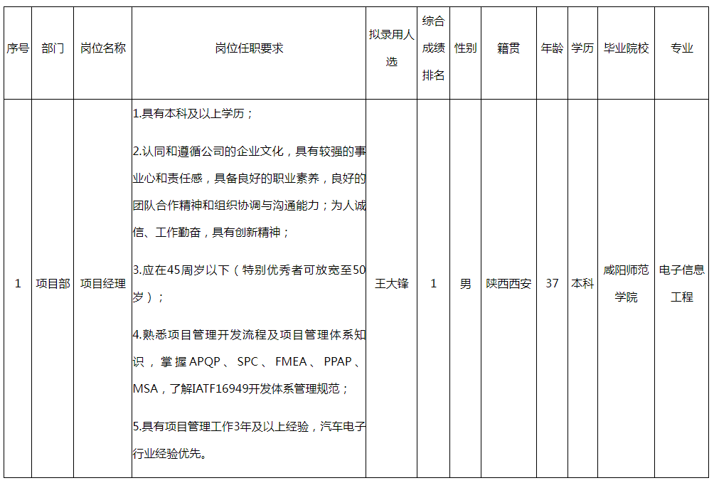根據(jù)重慶九洲隆瓴科技有限公司發(fā)布的招聘公告及招聘相關(guān)規(guī)定,經(jīng)筆試、面試、考察、體檢等程序,擬錄用王大鋒同志到重慶九洲隆瓴科技有限公司工作,現(xiàn)予以公示,具體情況如下: