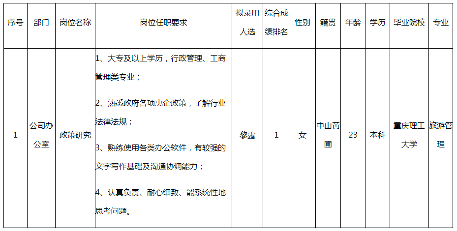 根據(jù)廣東長虹電子有限公司發(fā)布的招聘公告及招聘相關規(guī)定,經(jīng)面試、考察、體檢等程序,擬錄用黎露同志到公司辦公室工作,現(xiàn)予以公示,具體情況如下:
