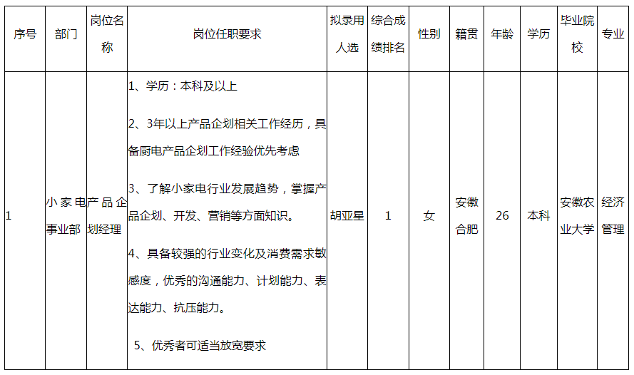 根據(jù)公司經(jīng)營管理需要,小家電事業(yè)部招聘產(chǎn)品企劃經(jīng)理崗位1人,經(jīng)簡歷篩選、面試、體檢等程序,胡亞星滿足錄用條件,現(xiàn)予以公示。