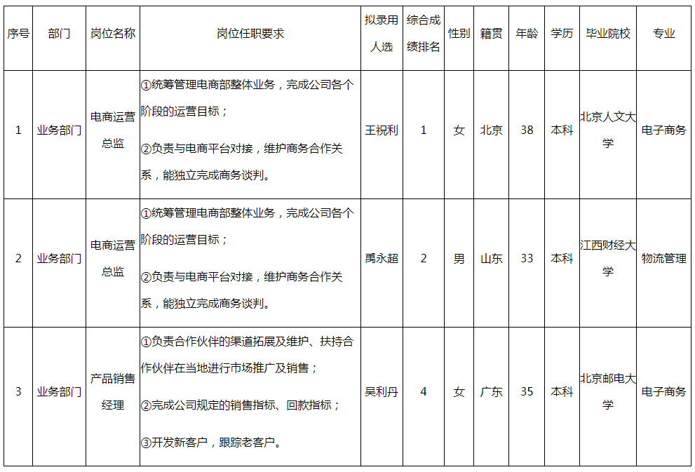 根據(jù)四川長(zhǎng)虹佳華信息產(chǎn)品有限責(zé)任公司發(fā)布的招聘公告及招聘相關(guān)規(guī)定,經(jīng)筆試、面試、考察、體檢等程序,擬錄用王祝利、禹永超、吳利丹同志到四川長(zhǎng)虹佳華信息產(chǎn)品有限責(zé)任公司工作,現(xiàn)予以公示,具體情況如下: