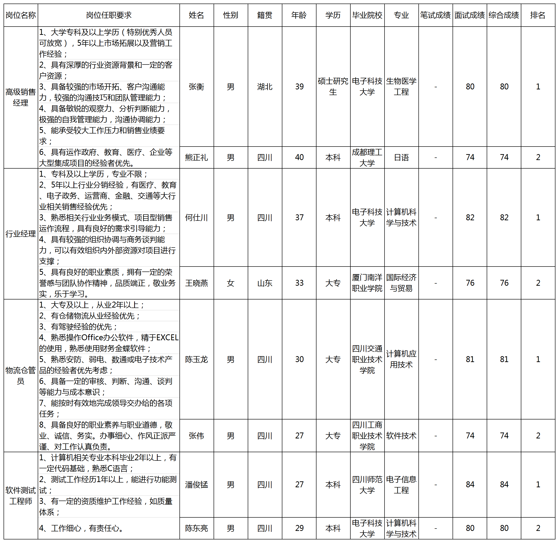 根據(jù)四川科瑞軟件有限責(zé)任公司發(fā)布的招聘公告及招聘相關(guān)規(guī)定,經(jīng)筆試、面試等程序,現(xiàn)將筆試(面試)成績(jī)予以公示。