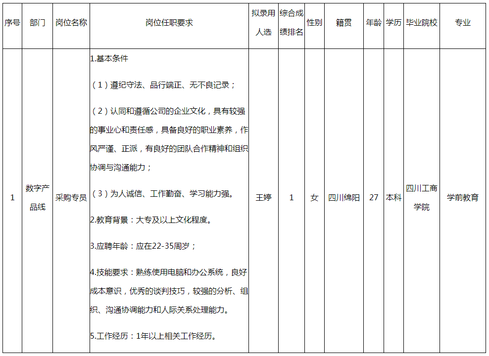 根據(jù)四川九州光電子技術有限公司發(fā)布的招聘公告及招聘相關規(guī)定,經(jīng)面試、考察、體檢等程序,擬錄用王婷同志到四川九州光電子技術有限公司工作,現(xiàn)予以公示,具體情況如下: