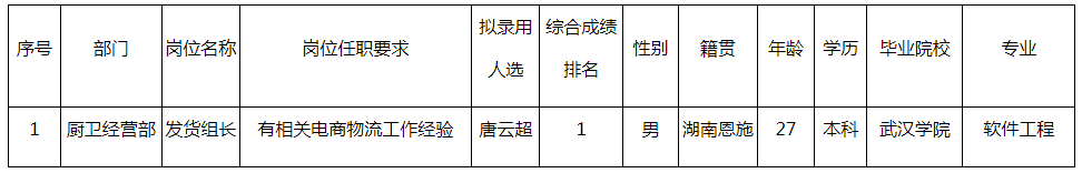 根據(jù)長虹美菱日電科技有限公司發(fā)布的招聘公告及招聘相關(guān)規(guī)定,經(jīng)面試、體檢等程序,擬錄用唐云超同志到長虹美菱日電科技有限公司工作,現(xiàn)予以公示,具體情況如下: